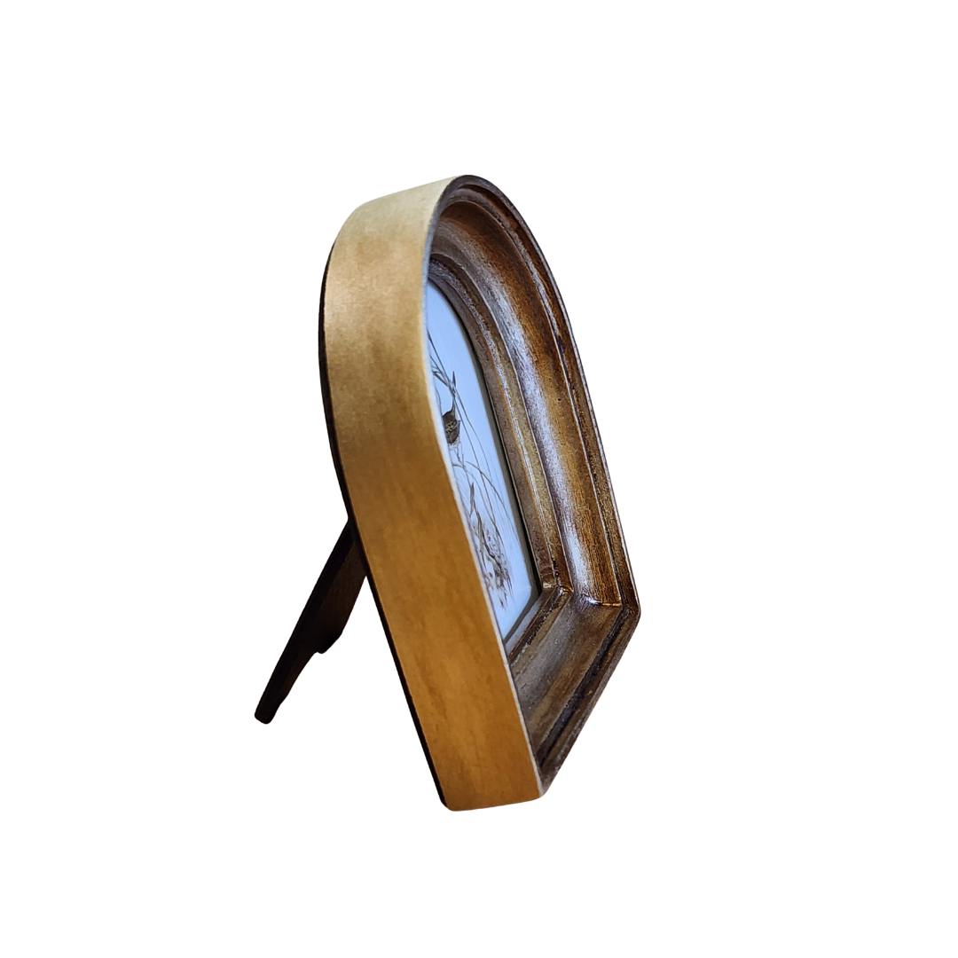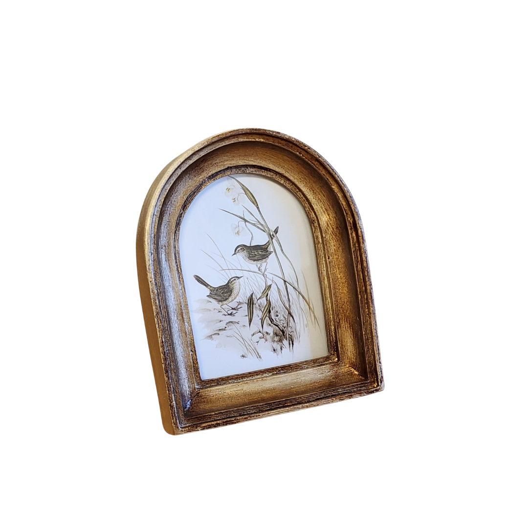 This gold, distressed arched frame is perfect for displaying a cherished photo, or you can keep the lovely bird print that comes inside! It will complement your home decor beautifully. Additionally, it features a hook on the back for easy hanging on the wall.