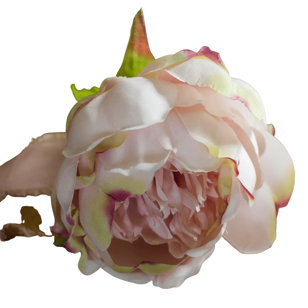 This beautiful peachy pink rose that will be perfect paired with other silk flowers, or pretty in your favorite vase! Some of the petals have yellow and dark pink tips. At the bottom are silk green leaves on a brown stem.