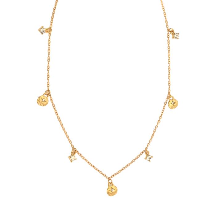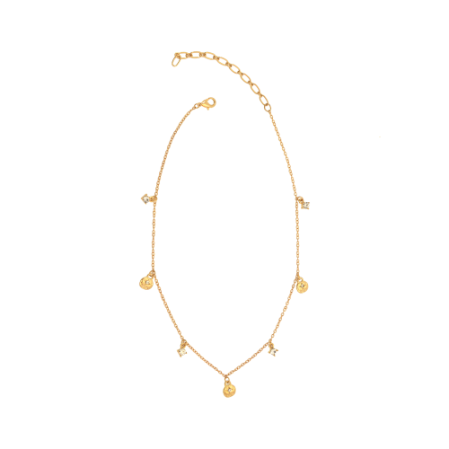This pretty necklace has a link 16+ chain with seven different charms hanging from it. Three of the gold charms have a bit of sparkle from the rhinestones on them, the other four charms are sparkling rhinestones.